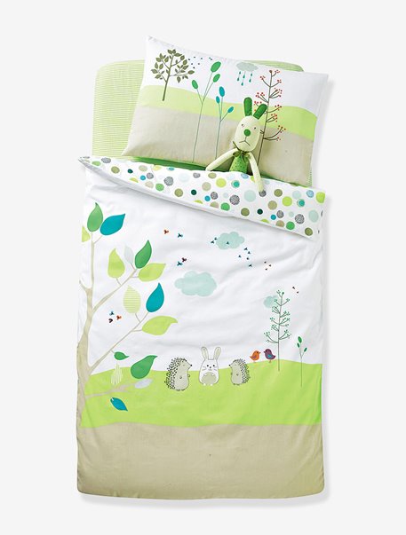 - Uma face estampada com árvores, ouriço-cacheiro, coelhos sobre fundo branco, verde e bege, uma face totalmente estampada.