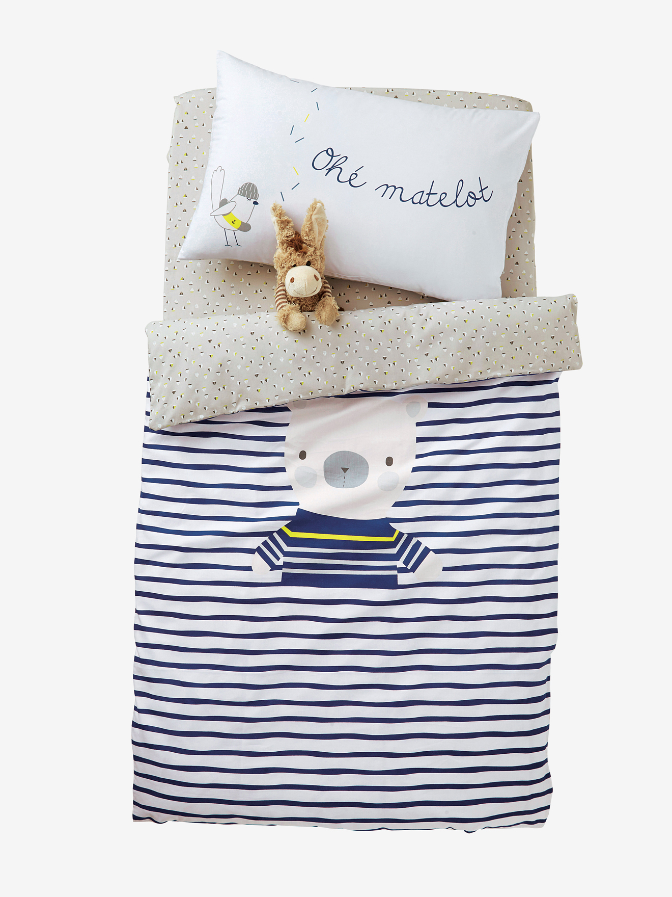 Estilo marinheiro muito moderno realçado por um bonito marinheiro para esta capa de edredon moderna. DIMENSÕES: Existe em 2 tamanhos: 80 x 120 cm e 100 x 120 cm.