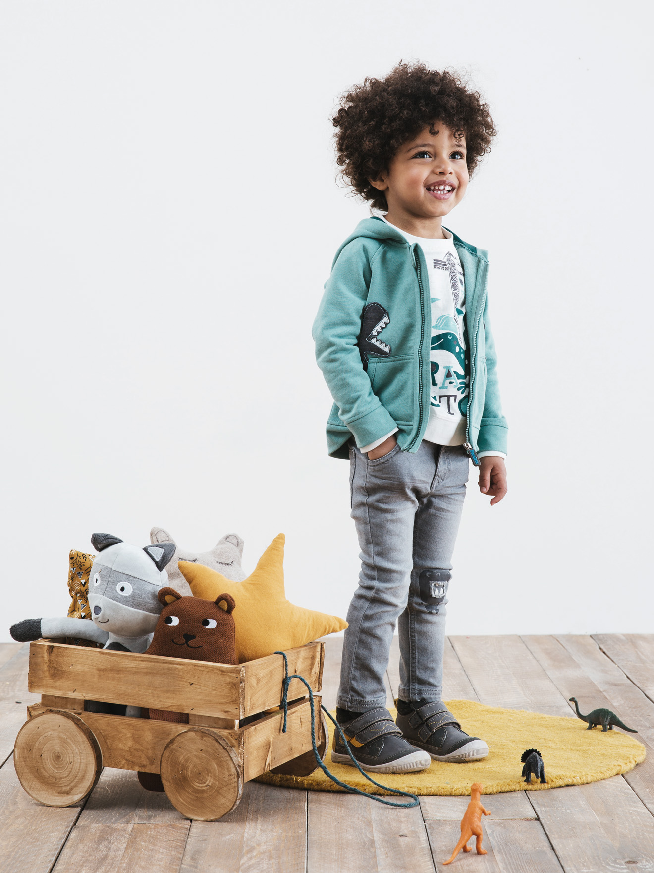 Saiba mais... Um estilo encantador garantido com este casaco com fecho e capuz estilo dinossauro realçado por uma crista!