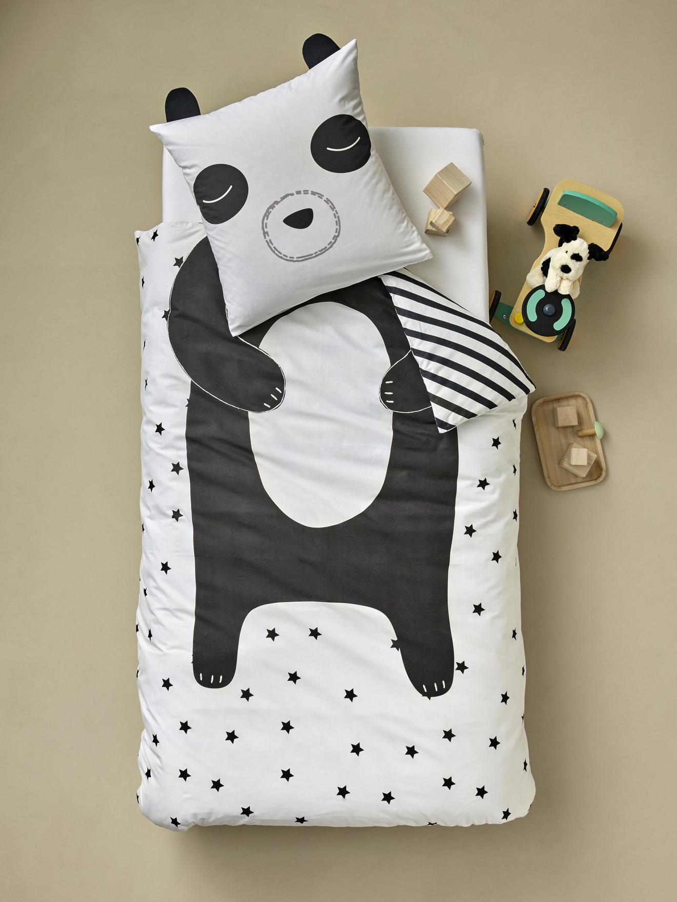 Saiba mais... Original, a fronha de almofada com orelhas acolchoadas em relevo, em cima! O conjunto capa de edredon + fronha de almofada forma um panda a dormir muito tranquilizador para acompanhar o seu filho em sonhos bonitos.