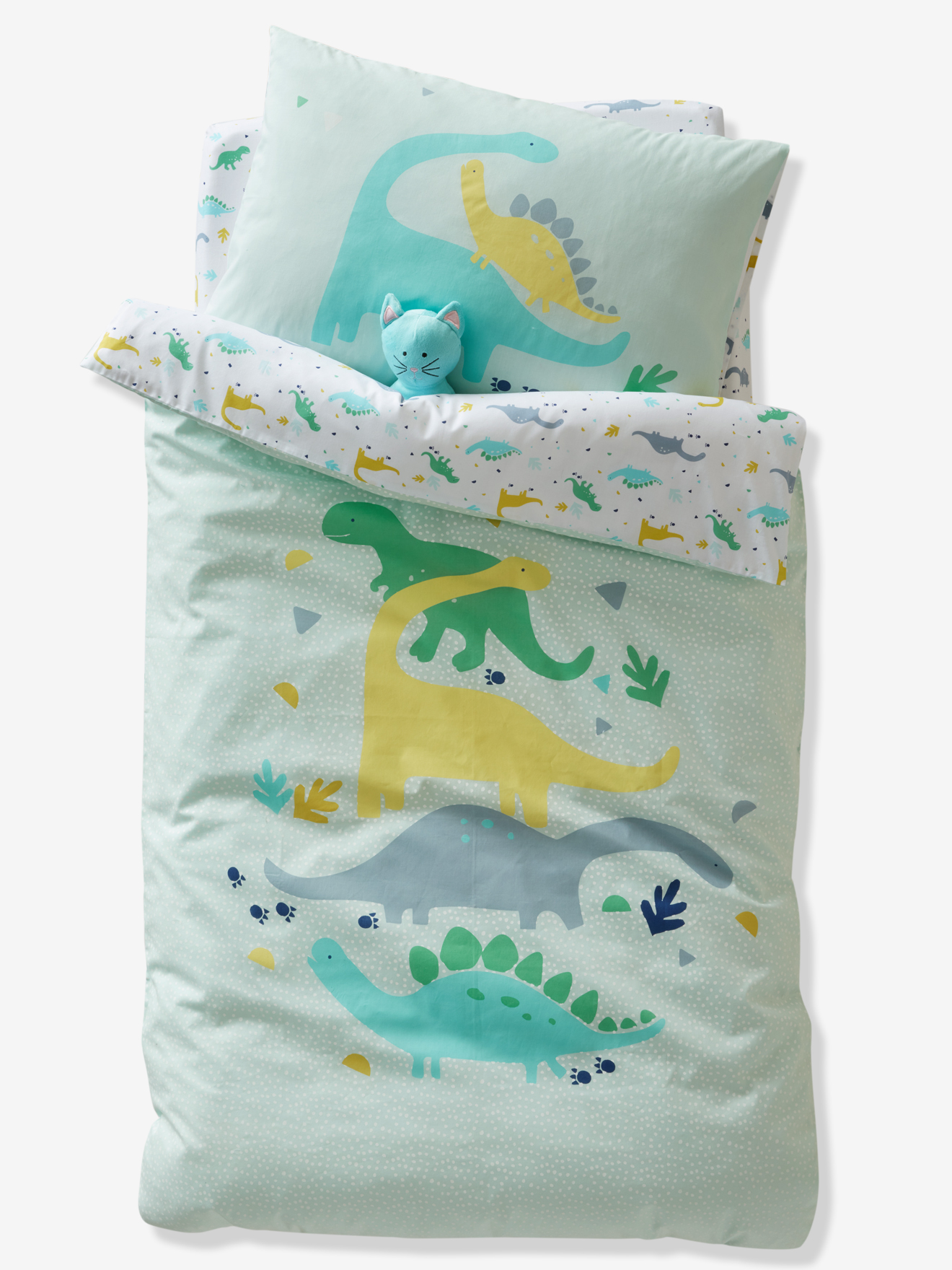 Saiba mais... Uma invasão de dinossauros para esta capa de edredon de bebé supersimpática e que segue a tendência do momento! Uma face estampada com 4 dinossauros grandes e uma face estampada... cabe-lhe a si escolher, consoante o seu humor!