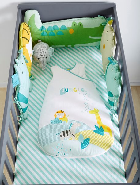 - Contorno de berço completo 30 x 360 cm: 10 almofadas intercambiáveis de 30 x 30 cm, 2 das quais maiores (30 x 60 cm), 1 para a cabeceira e 1 para os pés