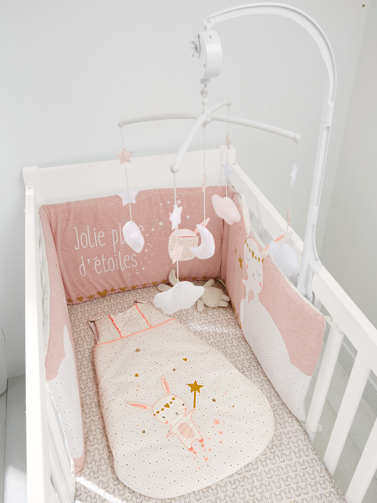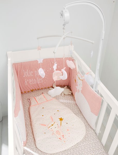 Saiba mais... Com um toque da varinha mágica, o adorável coelho deste contorno de berço dispara uma chuva de estrelas sobre o sono do bebé.