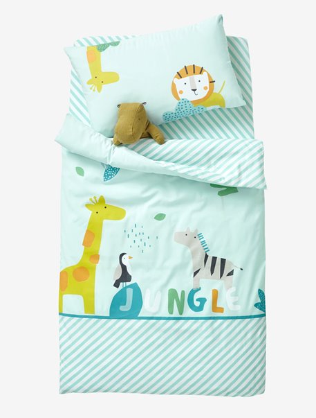 Saiba mais... Um jogo de diagonais para este lençol-capa com cores refrescantes que realçam a decoração animal da capa de edredon e da fronha de almofada do mesmo tema.