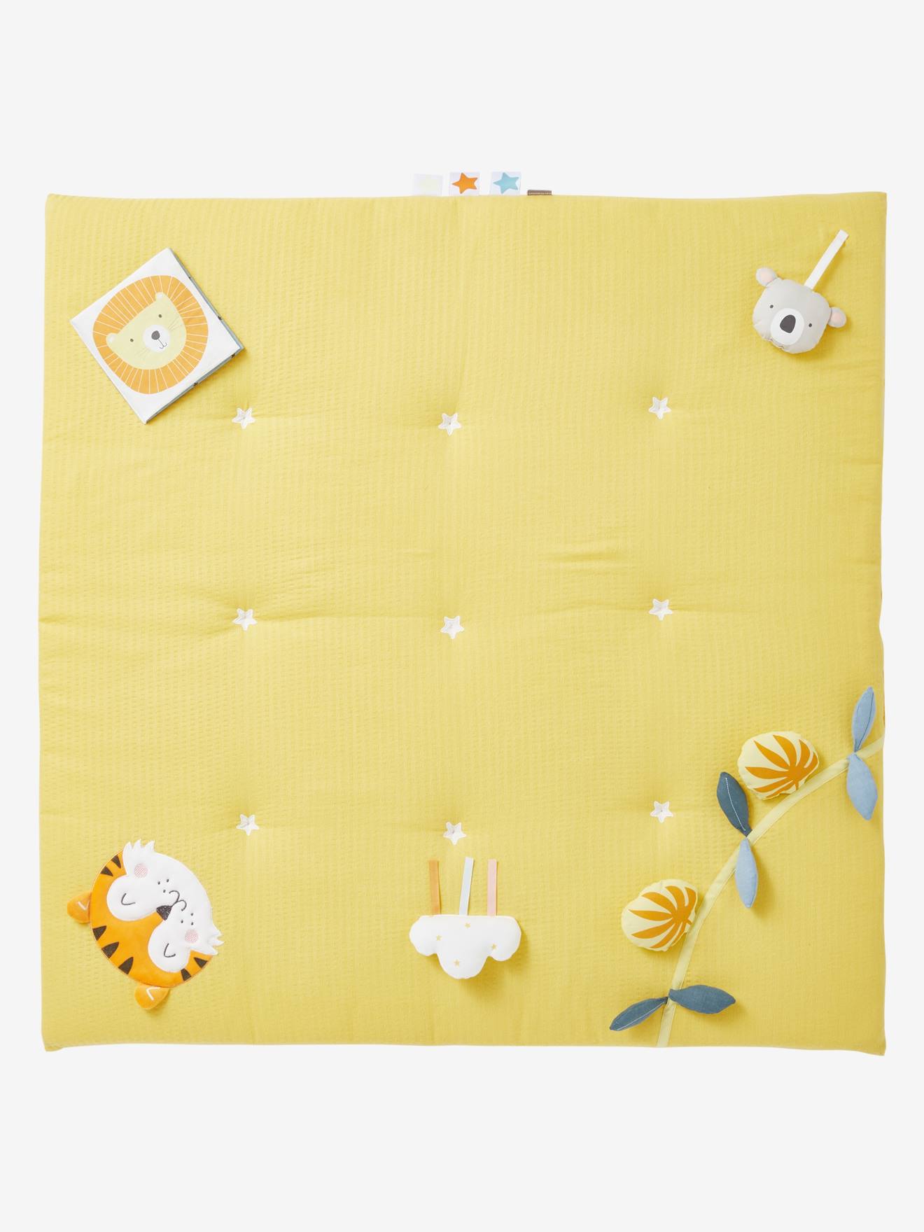 - Brinquedos presos ao tapete: 1 tigre aplicado com orelhas em relevo - 1 nuvem aplicada com guizo e 3 fitas - 1 livro com 4 páginas em algodão estampado, cosido na borda, com papel ruidoso - 1 panda preso por um cordão com sino - 1 grinalda aplicada com folhas cosidas - 3 estrelas cosidas de lado